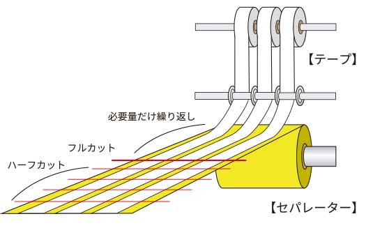 パーツ貼り合せ両面テープの作業ムラ、在庫削減! 2026年1月21日 最終更新日時 : 2026年1月21日 logical-tape 【改善前|お悩み・ご要望】 製品の樹脂パーツを両面テープで貼り合せる際、自社でハサミでカットして作業しています。作業者によるサイズのバラつきが発生し品質面が心配。また、両面テープもケース単位での発注のため在庫が余り困っている。 【改善後】 作業者によるハサミでのカット作業から、1シート3列+定寸でハーフカットを入れる仕様に変更しました。テープ加工品に変更したことにより、製品の品質と貼り合せ作業の効率が向上しました。また、使用テープも弊社の在庫品を流用することで少ロット対応も可能になり、在庫削減にもつながりました。 【加工イメージ】 【仕上りイメージ】 ※イメージです ●提案した加工はコレ! セパレーターに指定幅のテープを並べてハーフカット加工!材料の無駄なく、指定サイズのテープが作成できます! ハーフカット加工を詳しく見る お問い合わせはこちらから