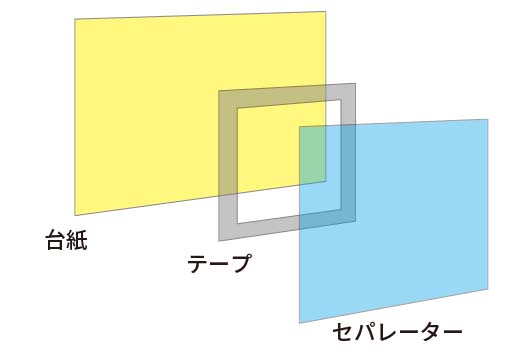 両面テープの台紙、テープ、セパレーターの各層を異なる形状に加工することができます。例えば、台紙が長方形、テープを被着体に合わせた小さい中抜きの四角、セパレーターを剥がしやすくする為、台紙サイズから両端をカットしたサイズに仕上げるなんてことも可能です。ご希望の仕様に加工することで、テープ作業の精度、効率が向上する加工です。